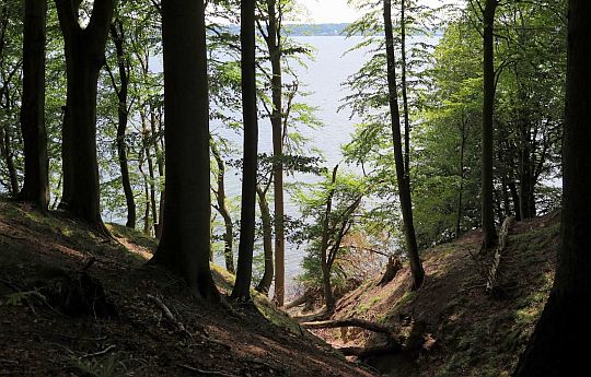 Nu eens loop je onderlangs de klif en zie je de nestopeningen van de oeverzwaluwen, dan weer loop je enkele honderden meters landinwaarts over een hooggelegen weggetje, maar ook daar blijft de Förde zichtbaar. - Skelde Kobbelskov – beukenbos boven op ca. 20m hoge klif