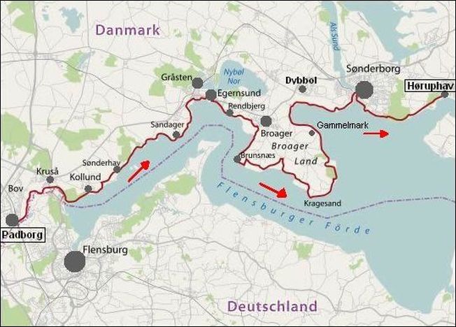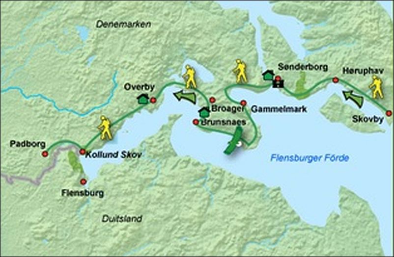Net over de Duits-Deense grens, ligt op de noordelijke oever van de Flensburger Förde het Gendarmepad. Dit langeafstandspad tussen Padborg en Høruphav (op het eiland Als) is 74 km lang, dus ongeveer 4 wandeldagen. Zoals je op de kaart ziet, is het een écht kustpad. De zee is alom aanwezig.