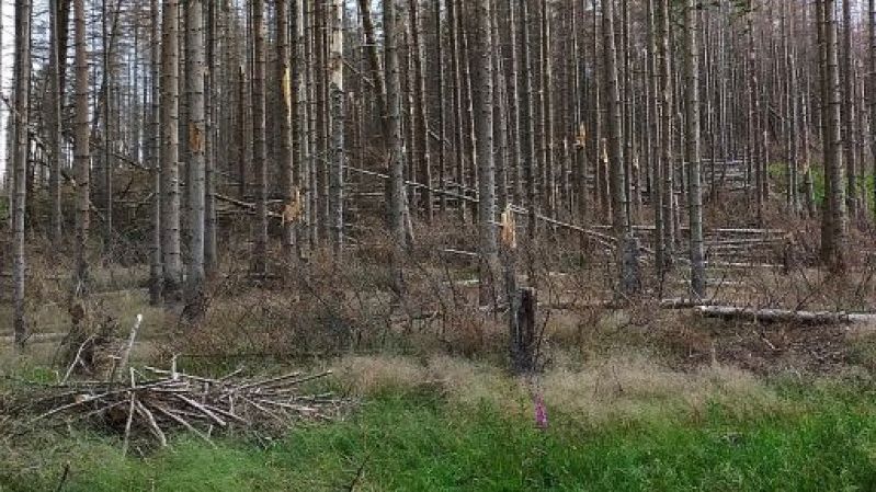 Fichtenmonokultur, welche vom Sturm “Kyrill” geschädigt und anschließend vom Fichtenborkenkäfer befallen wurde. www.nationalpark-harz.de