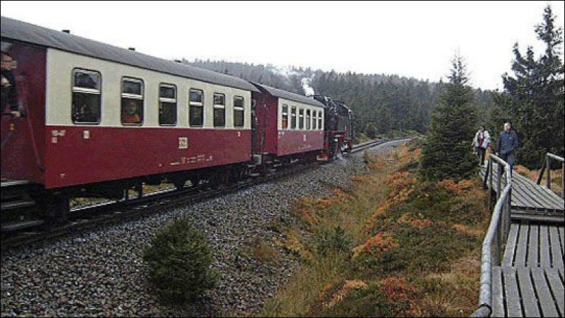 Torfhausmoor met smalspoorlijn. De nostalgische stoomtreinen van de ‘Harzer Schmalspurbahnen’ (HSB) rijden dagelijks tussen de Brocken en Bahnhof Drei Annen Hohne (aansluiting naar Wernigerode en Nordhausen). De treinen overbruggen het traject Drei Annen Hohne – Brocken in ca. 50 min. (19 km; hoogteverschil 585 m). Meer onder www.hsb-wr.de/