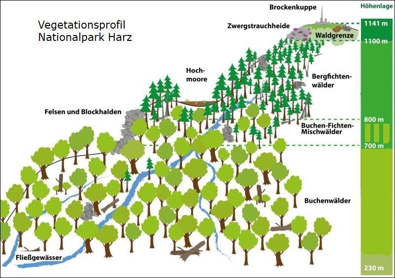 In het Nationalpark Harz beslaan ze momenteel echter slechts 17% van het oppervlak, terwijl dit op basis van de natuurlijke hoogtezonering meer dan 50% zou moeten zijn.