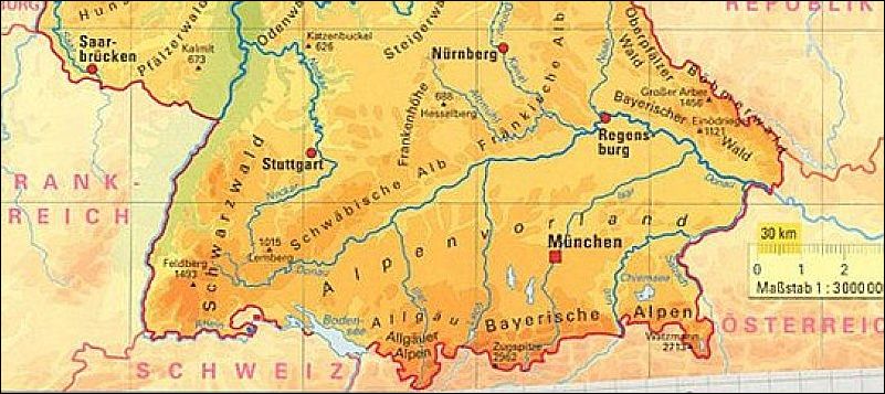 Het fraaie Alpenvorland ligt tussen de middelgebergten (Schwäbische Alb, Fränkische Alb, Bayerischer Wald (in het noorden) en de Nordalpen (in het zuiden). Het is daar overal mooi, maar wel in het bijzonder in het Zwitserse deel.