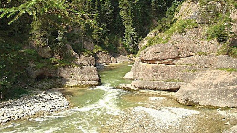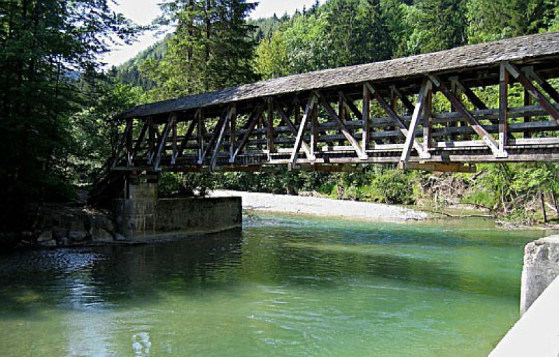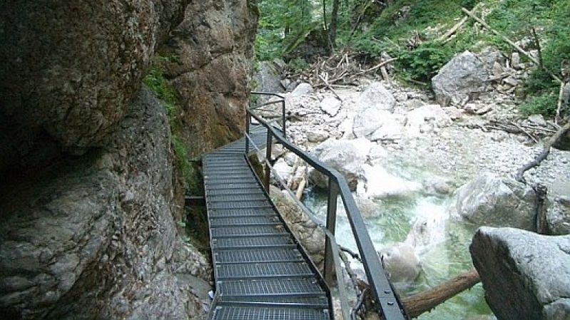 Kalkofensteg in der Ammerschlucht; eine holzgedeckte Fußgängerbrücke.