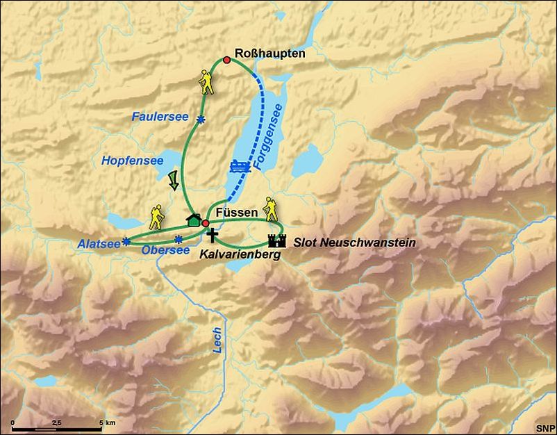 Het langeafstandspad eindigt in Füssen (aan de voet van de Alpen), vlak bij zijn sprookjeskasteel Neuschwanstein (en het slot Hohenschwangau, waar hij zijn jeugd doorbracht).