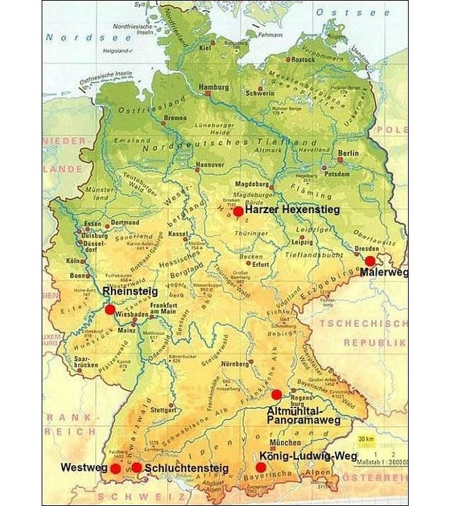 De paden zijn niet gelijkmatig verdeeld over de vier Großlandschaften in Duitsland. Zes bevinden zich in het Mittelgebirge en één (de König-Ludwig-Weg) in het Alpenvorland. De andere twee Großlandschaften, het Norddeutsche Tiefland (Noord-Duitse Laagvlakte) en de Alpen, hebben geen enkel pad. (Een goede uitleg over de vier Großlandschaften vind je hier: studyflix.de/erdkunde/groslandschaften-deutschland-3806).