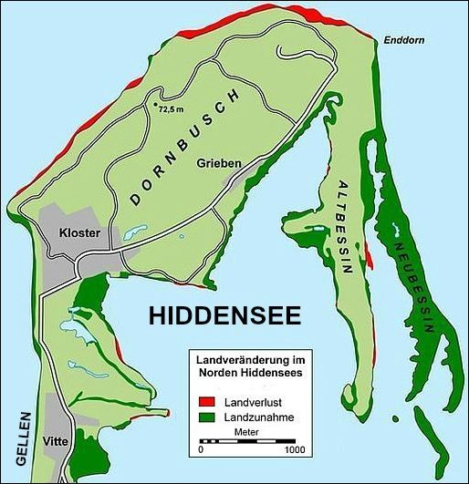 De erosie vindt op Hiddensee vooral plaats bij de aktieve eindmorenekliffen van de Dornbusch. Zie: www.youtube.com…