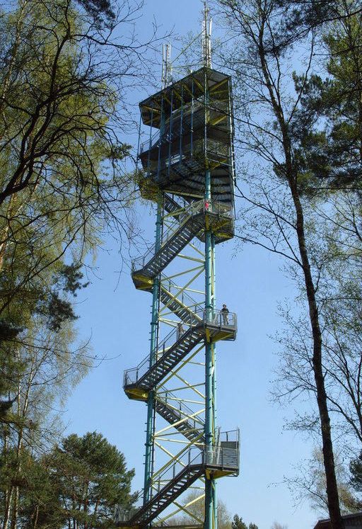 Omdat de toren zelf ook al op een hoog punt staat, zie je de boomkronen ver onder je.