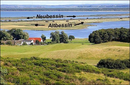 Hier kijk je vanaf de Dornbusch naar het gehuchtje Grieben met daarachter de beide parallel liggende zandhaken Altbessin en Neubessin