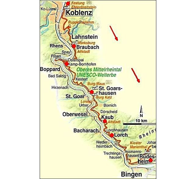 Opmerking: Het is ook aantrekkelijk om de Rheinsteig in omgekeerde richting te lopen, dus van Rüdesheim naar Koblenz. Zo kun je na afloop eventueel nog een extra dag doorbrengen in de oude vestingstad Koblenz, met haar ligging aan het Deutsches Eck, het Kurfürstliches Schloss en de kabelbaan naar Festung Ehrenbreitstein.