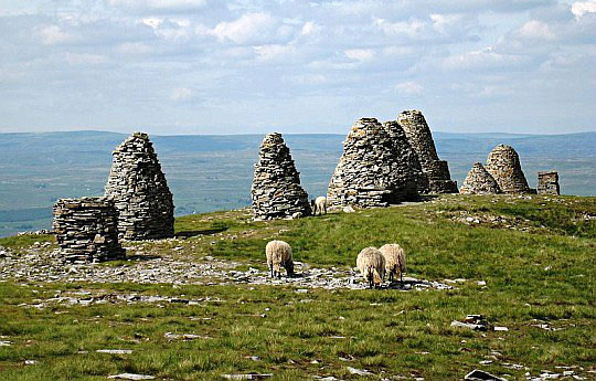 Schapen grazen bij de Nine Standards Rigg, een verzameling cairns (steenhopen), boven op de Pennine watershed (=waterscheiding). Je bent hier in het upland (=all land above the upper limit of enclosed (=omheind) farmland).