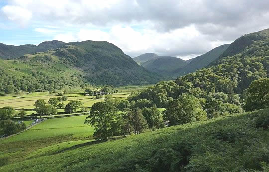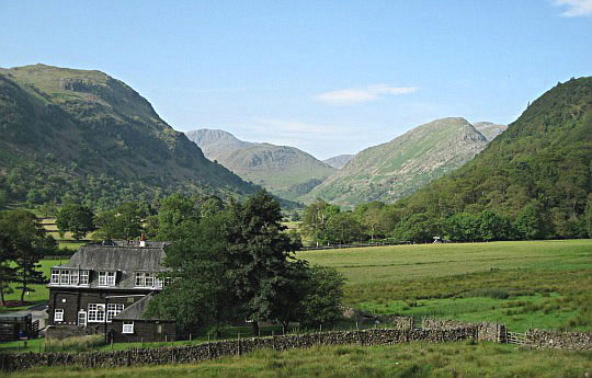 Seatoller in Borrowdale met ommuurde schapenweiden.