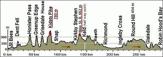 - in het Lake District. Hoewel de route van Wainwright veelal de passen volgt, beschrijft hij ook een aantal varianten over bergtoppen met mooie uitzichten. Alleen aan het eind van het Lake District moet de route over de bergrug van High Street heen en heb je geen andere keus dan Kidsty Pike op te klimmen (met 781m tevens het hoogste punt langs de route).