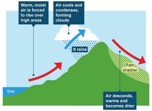 - Aan de westkust stijgt relatief warme, vochtige lucht van zee op tegen de helling van een berg.