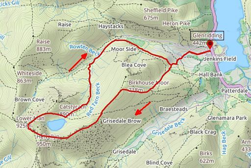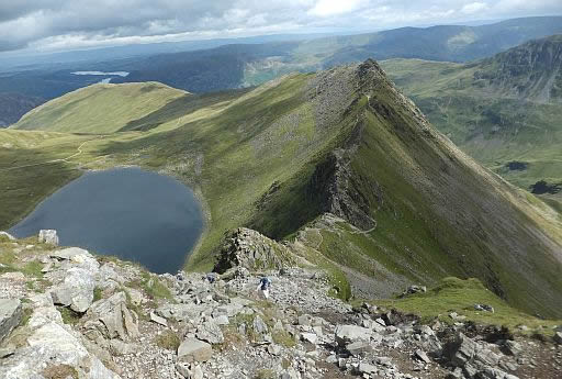 At the low point of the Swirral Edge ridge, follow the path that leads down towards the impressive glacial bowl (=kaar) containing Red Tarn then follow the obvious path down the valley to Glenridding.