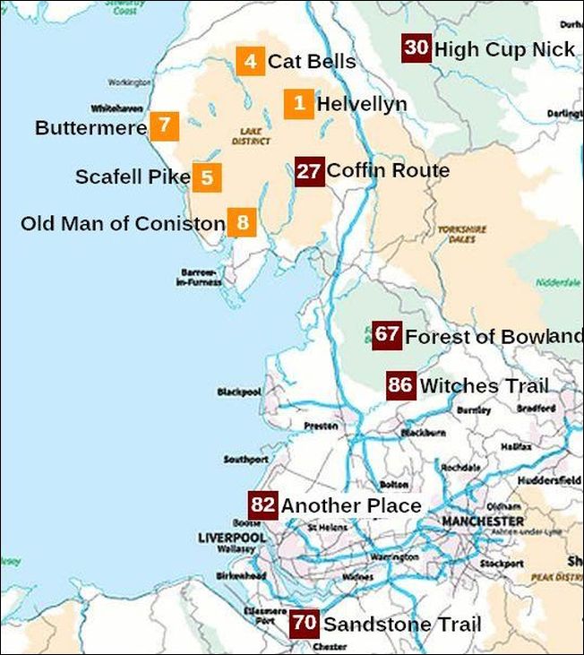 Op de kaart zie je hoe uniek het Lake District is met maar liefst 5 wandelingen in de Top 10.