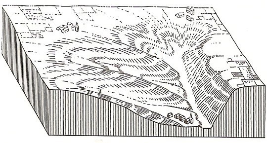 - Op het hellende terrein voerde water dan het losgeraakte materiaal naar beneden en zo ontstond door de eeuwen heen een klein erosiedal met steile wanden.
