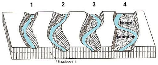 Daarna maakt de breedte-erosie het V-dal tot een dal met een brede dalbodem (3+4).