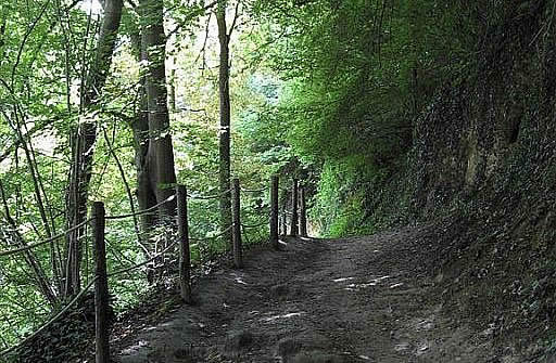 De beek schuurt hier langs de steile, beboste dalwand. Hierdoor kon men geen pad onder langs de beek aanleggen, maar moest men wat hogerop gaan. Langs het afgrondje zijn voor de veiligheid touwen gespannen.